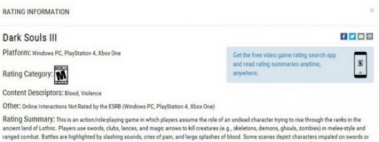 《黑暗之魂3》日版将于3月24日发售(PC/中文版皆为4月12日),今天ESRB公开了对于本作的评级信息,本作评级为M,的确,在系列游戏中最多就是存在一些暴力和血腥元素,看来本作也依旧如此。