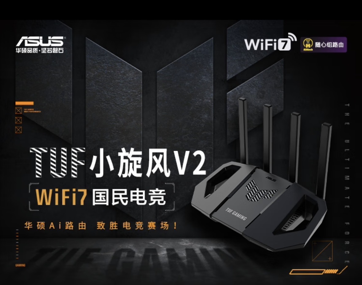 而如果你正在寻找一款更注重实用与稳定或适合中小户型的路由器,那么新推出的华硕TUF小旋风V2值得特别关注。它支持WiFi7技术,双频并发无线速率高达3600Mbps,并配备了2.5G高速端口,轻松应对2000兆宽带,也可作为LAN,在设备间高速传输,身份按需灵活变化。硬件上搭载了博通四核2.0G处理器,结合DDR4 1GB内存,确保多设备连接下的稳定运行。其内置的AiProtection网络神盾,能有效守护家庭网络免受恶意入侵。同时,这款路由器延续了TUF系列坚固耐用的品质,并支持AiMesh随心组网,支持与任一华硕机型路由器轻松组建全覆盖网络。对于预算有限、追求稳定实用且希望体验WiFi7技术的用户来说,华硕TUF小旋风V2在双十一期间是一个极具吸引力的入门选择。