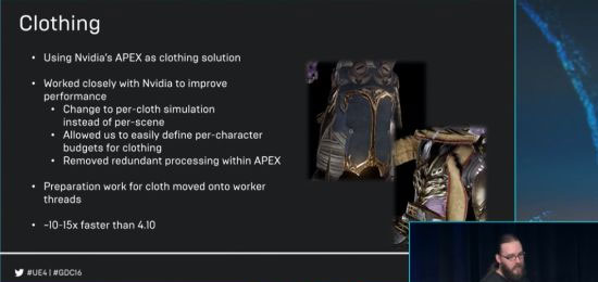 接着,讲到了除虚幻4引擎之外,《帕拉贡》还采用了NVIDIA的APEX技术来优化游戏人物衣服布料的问题,并获得了非常显著的提升,较虚幻4.10而言,效果提升10~15倍。